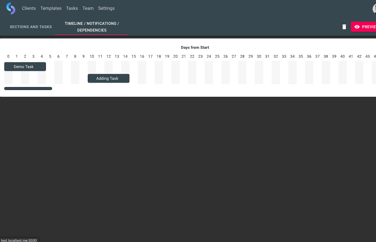 The Timeline helps you set due dates for all tasks within a template. When a template is assigned to a customer, the Start Date will reflect the current date.